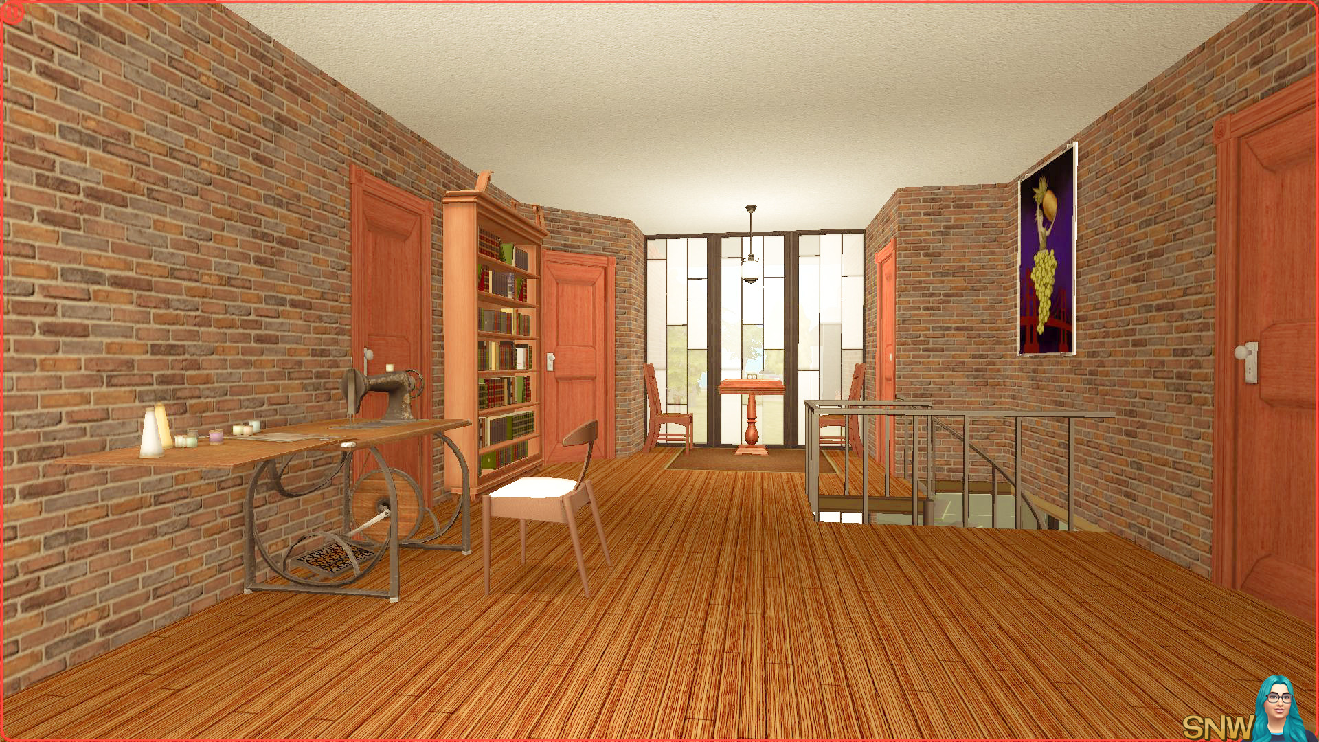 This mid-century house has no real hallway. You enter the house and have the kitchen and dining area on the left, a small office on the right and if you go straight ahead you'll end up in the living room area. It's all open plan, though it is divided by some neat windows. The living room has a sofa and two loveseats, a fireplace, a coffee table, a cat scratch pole and two bookcases. The office has a desk with phone (no computer because, yeah, mid-century lol), and a pet bed in the corner. The kitchen has all the necessities, a dining area for 4 people and one high chair. There is also a small entertainment area in the back of the house, with a piano, easel and some children's toys. The downstairs bathroom has a toilet, sink with mirror, and a litter bin for cats. Yes, it's a pet friendly house. Because there is also a dog house in front of the house. Down the back of the house is a telescope. Bring on the aliens!
