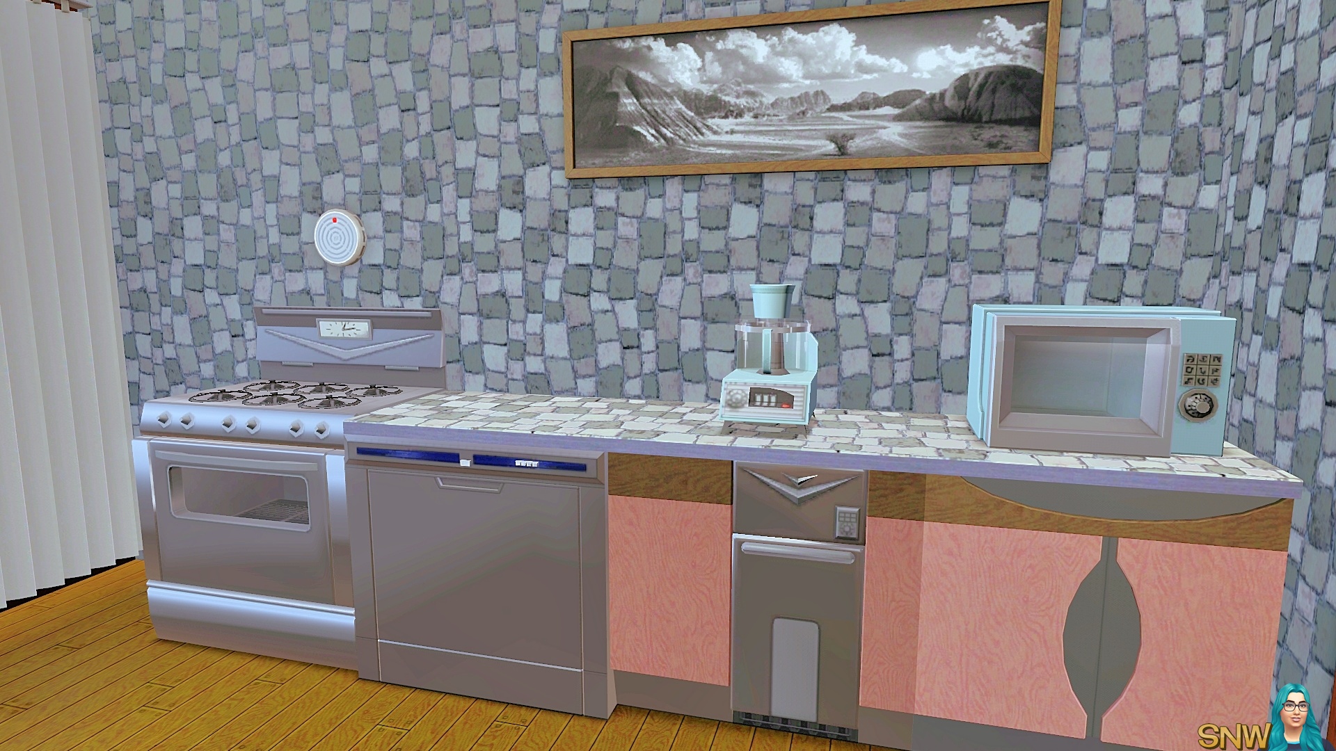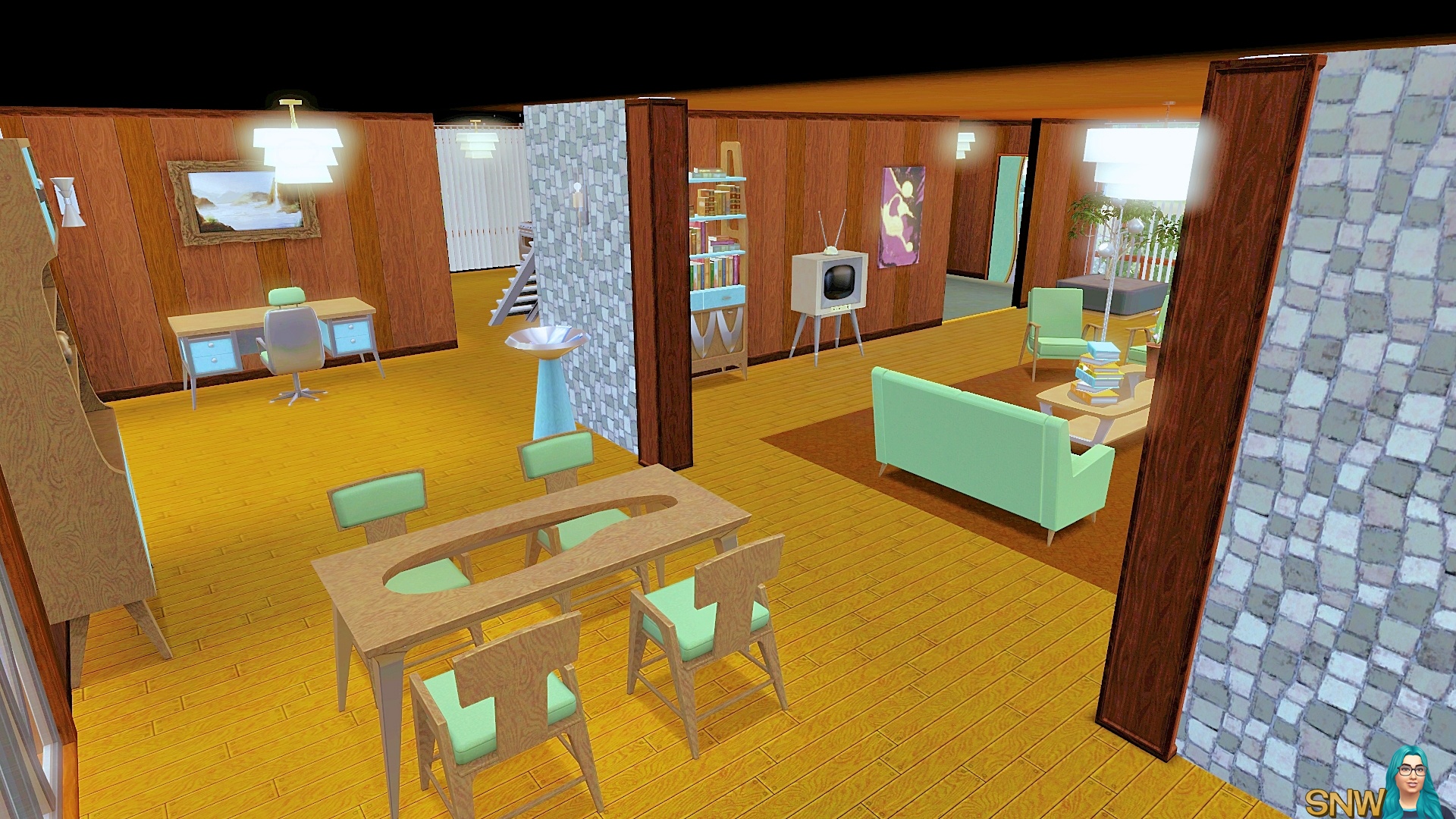 This house uses most of the expansion packs up until The Sims 3: Seasons. And some stuff packs. I also used a lot of official store content. Mostly the mid-century sets, and the Christmas tree. I think the telephone in the living room is an incentive store item from The Sims 3: Generations.