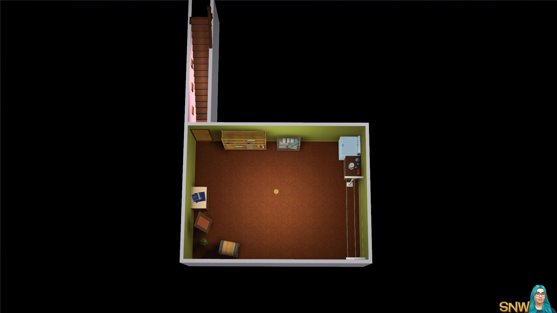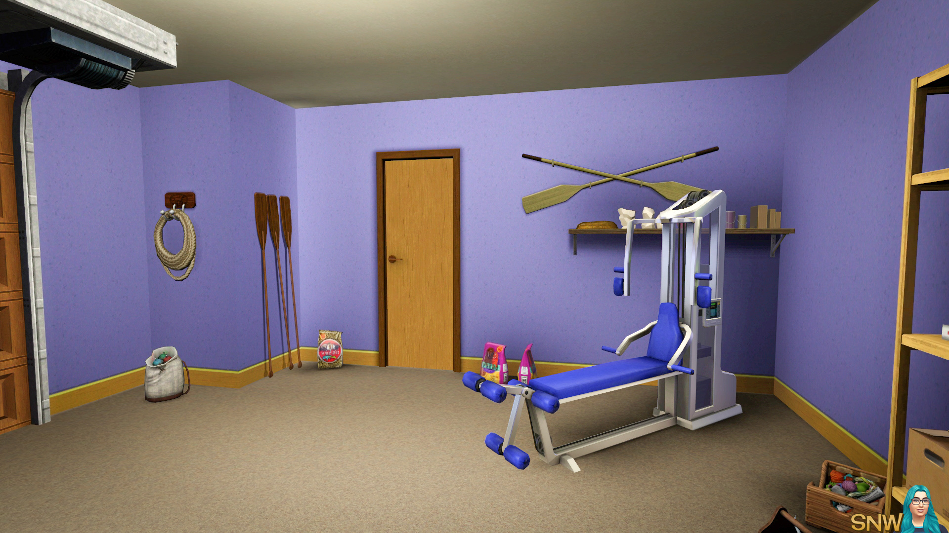 Now I've watched a lot of episodes to get this right. However you will find some odd things. I've not used all the space simply because it didn't add up with the show. I have placed a fireplace like in the show. But since the house in the show did not show a chimney, I've hidden the chimney underneath the roof. So it's functional, but hidden. The basement supposedly is so long it runs underneath the road. That's not possible in The Sims 3, so I opted to only build the one room I actually saw on the show, and not add another room. Even though there is something more in the basement. And finally, I have not seen a toilet on the Garfield show, not once. Now I've skipped through the episodes pretty quickly. And I've certainly seen the bathroom twice. But no toilet. So I cheated that one in anyway. Cause what kind of house would this be without a toilet? The clutter and objects in the garage were all items that The Sims 3 simply does not have. Well some are available as store items. But I did not want to use anything from the store for this house. Examples are the lawn mower, (standing) surfboards, (standing) fan, ladder on the wall, et cetera. So there is clutter in the garage but it doesn't exactly match the show. Instead of dumbbells I used fitness equipment, instead of surfboards I placed paddles, and to make up for the lack of actual cardboard boxes, I put down a load of crates with clutter. Same issue on the bathroom. The actual bathroom on the show did not have a toilet, but it did have a radiator. Well we don't have that in The Sims 3, so I didn't place one of those either.