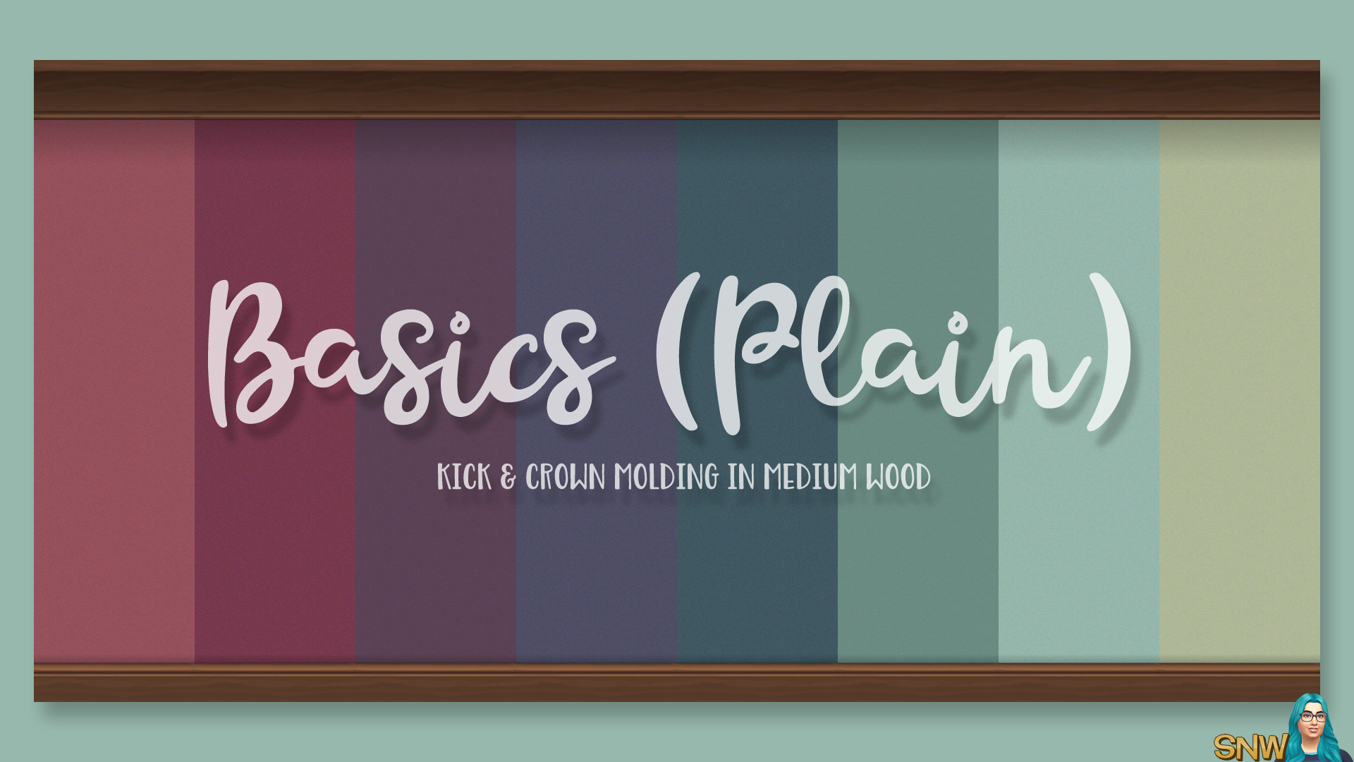 This wall is part of the Basics Wallpapers set. It's plain (it has no pattern). The walls have kick and crown moulding in medium wood. There are 32 colour options to choose from.