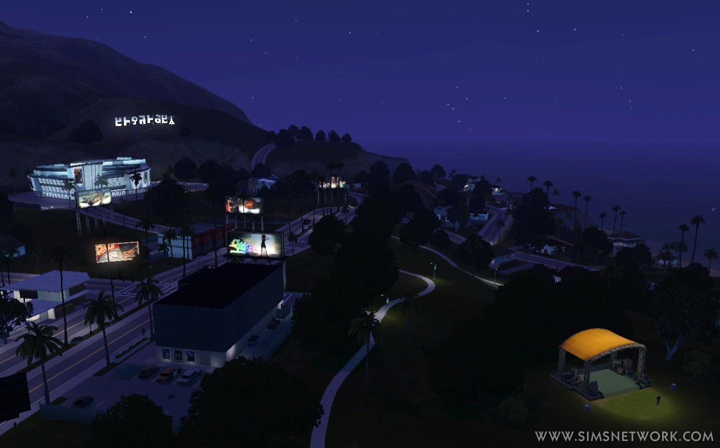 Starlight Shores is a beautiful new world that comes with The Sims 3 Showtime. As you can see on the screenshots, it's c combination of Los Angeles (Hollywood) and Miami. There are some cool art deco elements and in the distance you can see the Hollywood sign, albeit in Simlish.