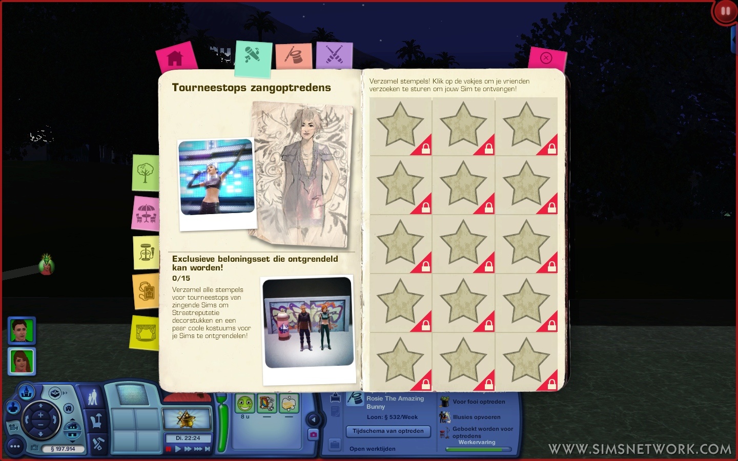 SimPort allows players to exchange their Sims with friends on the official Sims 3 website. So my magician Sim can go on tour. She'll then leave my game for about a Sim day or so, and my friend will then get a request. If accepted, my Sim will visit my friend's game and perform in that game. Then, when my Sim returns, I will receive a stamp. For each career there are 15 stamps to unlock. And each career has their own reward. For singers it's a Street Reputation stage set and cool costumes, for magicians it's a Mystical stage set and for acrobats it's a set of King and Queen chess pieces and two jester outfits.
