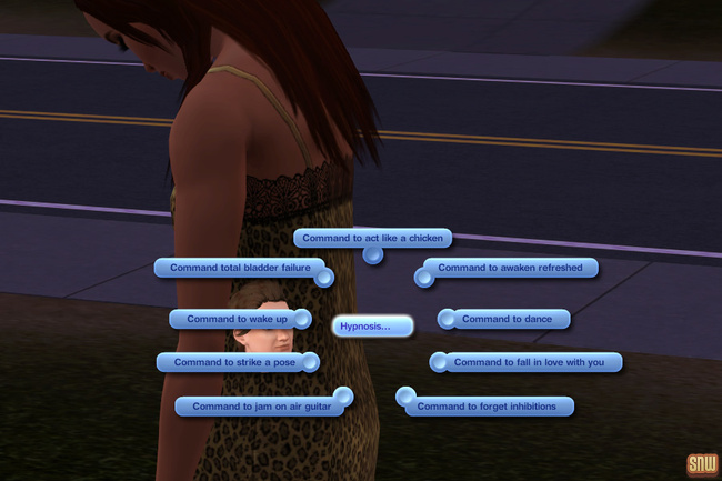 Once a Sim is hypnotized, another Sim can have the hypnotized Sim do a number of (sometimes embarrassing) Hypnosis actions.