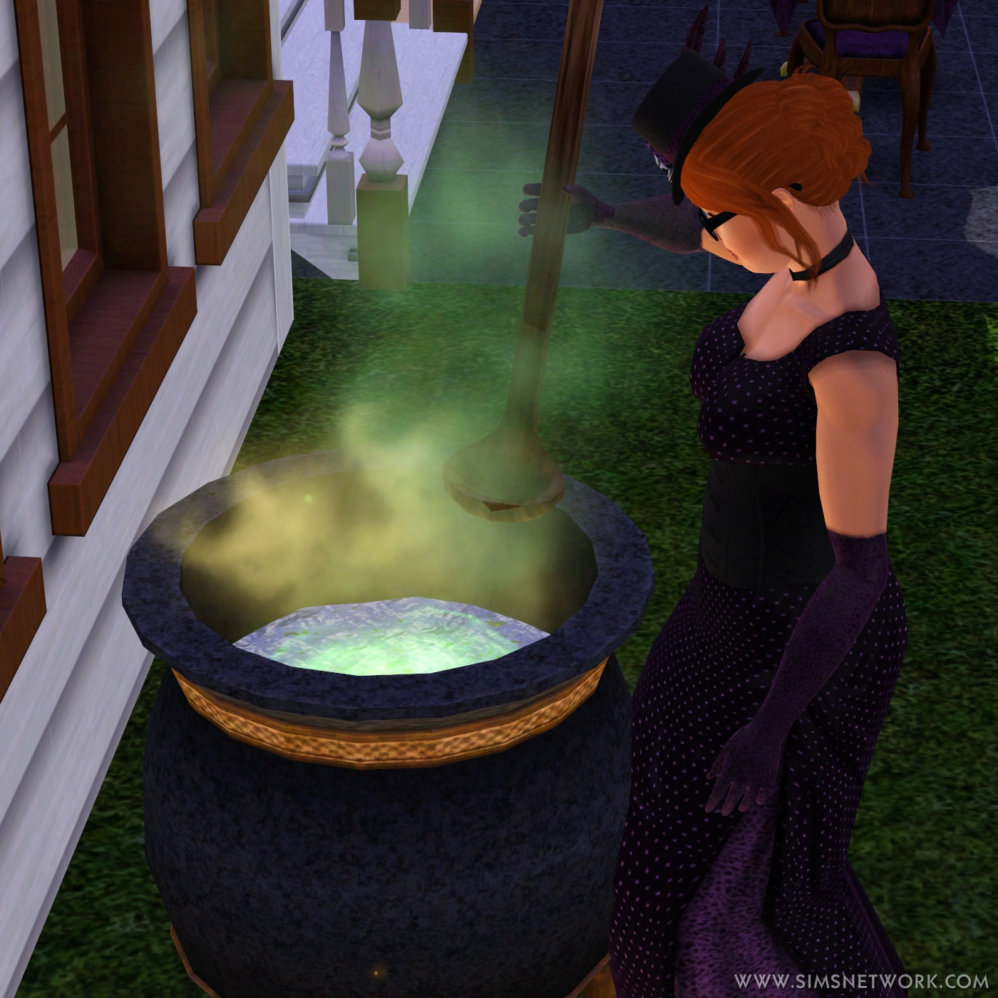 Sims can add up to 3 items in the cauldron by choosing Open. You can choose Conjure but I don't know what this does exactly. Once the ingredients have been added, you can choose Brew potion.