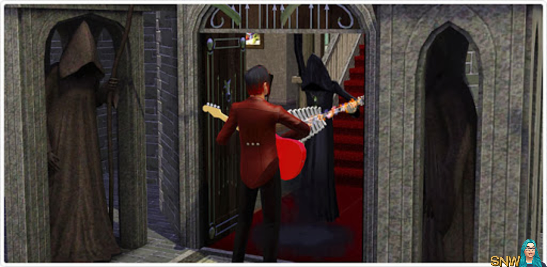 A: The good news is that Sims don’t mess with the door much on their own. So you won’t have a Sim who doesn’t have the Guitar skill pick up a guitar for the first time and challenge the Reaper to a duel they will surely lose.